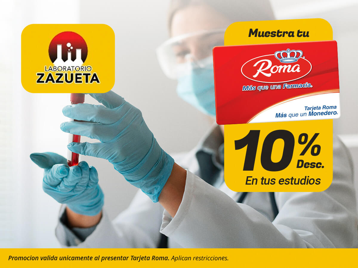 En tu próxima visita a Laboratorio Zazueta, muestra tu Tarjeta Roma y obtén el 10% de descuento en todos los estudios de laboratorio.