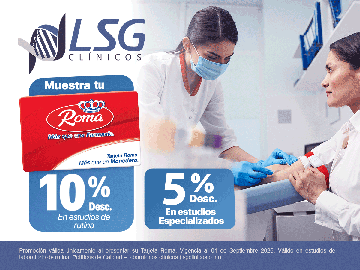Presenta tu Tarjeta Roma en tu próxima visita a LSG Clínicos y obtén un 10% de descuento en estudios de rutina y un 5% de descuento en estudios especializados.
